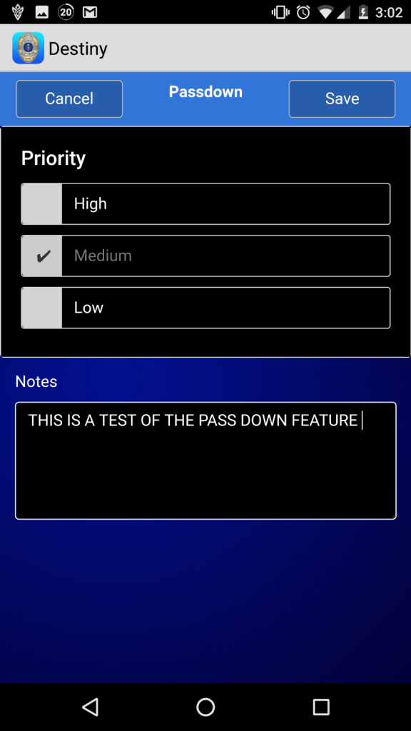 The passdown feature provides the officer in the field a means to communicate with fellow officers any concerns or issues that may need their attention such as a person who was instructed to leave the property. The passdown logs a written description of any details that may be necessary to other officers on patrol during a later shift.