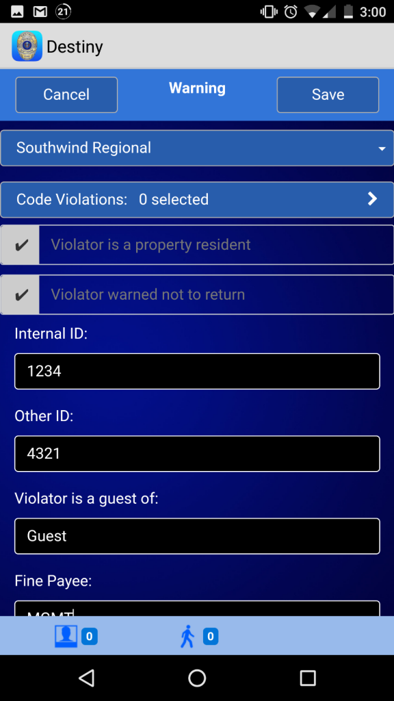 Once the warning notice screen (screenshot 2) appears on the device, the officer would enter in the violations, ids and fine amounts if applicable. The officer can provide a description of why the warning was given in the notes section. The officer can provide additional information of the suspect by pressing the individual button and adding an individual. The officer can also attach a picture by pressing the camera button to take a photo or pressing the gallery button to add an existing photo. Once the officer has completed adding all the details they may save.(screenshot 3)